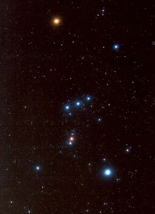 La lumière des étoiles est faible vue de la Terre et l'oeil est peu sensible aux couleurs dans ce cas. Cependant, quelques étoiles ont une légère tendance à être plutôt rouges ou plutôt bleues. Dans le ciel hivernal, quand la constellation d'Orion est bien visible, on peut remarquer que l'étoile en haut à gauche de la "tunique" est plutôt rouge, c'est Bételgeuse, une géante rouge en fin de vie. Pas très loin d'Orion, il y a le superbe amas des Pléiades qui sont un groupe d'étoiles très jeunes et plutôt bleutées. Malheureusement, le bleuté n'est jamais très intense et est assez proche du blanc finalement, donc assez difficile à distinguer.