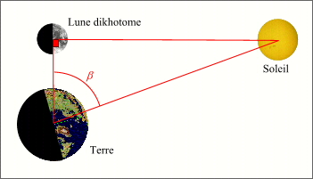 Remarques : Il convient de remarquer qu'à l'époque d'Aristarque les Grecques n'avaient aucune notion de trigonométrie, les premières tables de cordes sont attribuées à Hipparque. C'est pourquoi Aristarque ne tire pas directement la valeur du rapport des distances Terre-Lune et Terre-Soleil de l'angle b, mais encadre cette proportion grâce à des considérations purement géométriques.