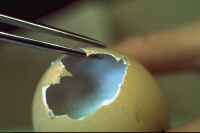 Avec des ciseaux, on arrondit l'ouverture à la limite de la membrane coquillière interne, blanchâtre (la membrane externe est collée à la coquille). Il faut l'ôter pour voir l'embryon.
