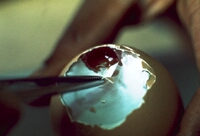 Pour cela déposer une goutte d'eau sur la membrane, et pincer délicatement la partie humide pour qu'elle se détache. Attention de ne pas arracher les vaisseaux sanguins ou la fine membrane de l'allantoïde. La membrane est retirée par la périphérie (depuis son insertion sur la coquille).