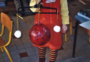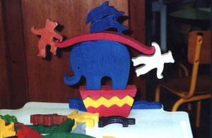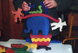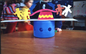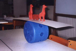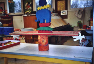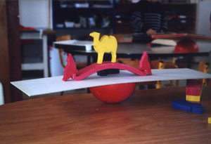 Pour recueillir les conceptions des enfants : Nous pouvons demander : - un dessin (plus ou moins dirigé). - entrer dans un dialogue. - mettre à la disposition de l'enfant un matériel plus ou moins structuré. Certains jeux limitent les découvertes et orientent l'enfant vers des "conceptions" limitées. Exemple des jeux d'équilibre en bois : Faire surgir des représentations c'est pouvoir organiser le monde des objets de façon adéquate par rapport au concept travaillé. Je voudrais développer ce dernier point. Je constate que le choix du matériel peut faire surgir des "représentations" c'est à dire des façons d'organiser le monde des objets. Ainsi un projet de mobile révèle la difficulté de parvenir à l'abstraction : au concept de masse. Un équilibre est obtenu pour eux par des objets identiques (en apparence). En fait l'identité porte sur des données visuelles et non sur la propriété abstraite : a la même masse. Les réalisations des enfants montrent leur difficulté à dépasser la donnée visuelle. Un matériel différent peut faire surgir des conceptions différentes (interaction).