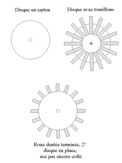 Un peu par hasard j'ai remarqué que certaines étaient bien crantées sur le pourtour, je les ai donc utilisées comme roues dentées en les clouant sur des planchettes de bois (un peu bruyant pour les collègues...)