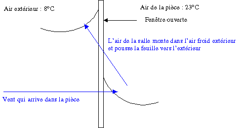 Visualiser les mouvements d'air à une plus grande échelle : Matériel : une feuille de papier très léger du type papier de soie (commercialisé en librairie par Canson ou bien récupéré dans les boîtes à chaussures). La masse d'air chaud sera une salle bien chauffée, la masse d'air froid sera l'air extérieur, un jour assez froid et sans vent. Ouvrir une fenêtre et attacher en haut votre feuille de papier de soie, on constate qu'elle est soufflée vers l'extérieur. Explication : dès que la fenêtre est ouverte, l'air de la pièce, plus chaud que l'air extérieur, monte dans l'air extérieur plus froid et pousse la feuille vers l'extérieur. Il est intéressant de refaire l'expérience à une fenêtre diamétralement opposée et faire le même constat. En revanche si on suspend la feuille en bas de la fenêtre, on constate qu'elle est soufflée vers l'intérieur. Explication : l'air froid de l'extérieur vient combler le vide laissé par la montée de l'air chaud et pousse la feuille vers l'intérieur.
