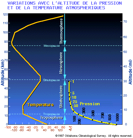 Pour comprendre le refroidissement de l'atmosphère avec l'altitude, il faut la considérer comme un système dynamique, où l'air est chauffé au contact du sol. Il se dilate, sa densité diminue et il s'élève (merci Archimède). Ce faisant, il se refroidit puisque lors de son ascension sa pression diminue. Ce modèle n'est pas trop faux, et, soumis au calcul, il donne le bon ordre de grandeur pour le refroidissement (6° par km). Ceci n'est vrai que dans la basse atmosphère, où cette circulation se produit normalement. Il peut se produire aussi le phénomène inverse, lorsque la terre froide refroidit l'air à son contact. Cette couche d'air froid n'a pas tendance à s'élever car l'air au dessus d'elle est plus chaud, donc moins dense. Elle reste donc immobile et piège tout ce qui s'y dégage de nauséabond et toxique. C'est l'effet d'inversion de température qui provoque le smog.