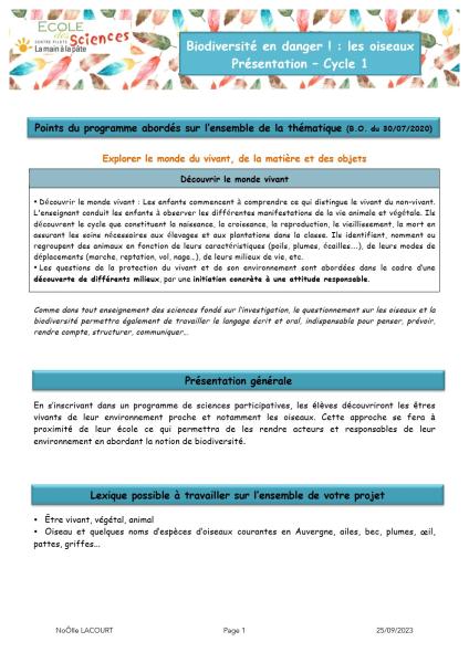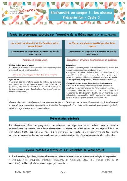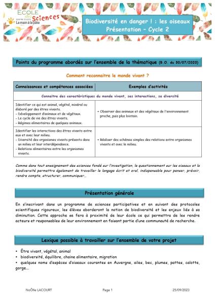 Page 1 du PDF de présentation : Biodiversité en danger ! Les oiseaux