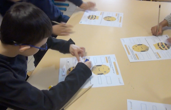 On aurait pu passer directement à la programmation sur des environnements type tapis que l’on trouve dans le commerce, mais nous avons fait le choix ici d’utiliser Beebot pour travailler sur la notion d’unité en mathématiques en utilisant le pas de l’automate, un déplacement vers l’avant correspondant à 15 cm, correspondant à une unité dans la situation. L’utilisation de cartes de 15cm de côté, symbolisant une ruche d’un côté et une fleur de l’autre, permet d’engager un travail de graduation d’une bande de papier, sur laquelle, pour chaque case matérialisée, les élèves vont noter à quel nombre de déplacements elle correspond ainsi que le programme de déplacement qui permet d’y accéder.